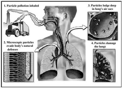 Particulate matter irritates the eyes, nose, throat, and lungs, contributing to respiratory and cardiovascular illnesses and even premature death. Although everyone is susceptible to diesel soot pollution, children, the elderly, and individuals with preexisting respiratory conditions are the most vulnerable. Researchers estimate that, nationwide, tens of thousands of people die prematurely each year as a result of particulate pollution. Diesel engines contribute to the problem by releasing particulates directly into the air and by emitting nitrogen oxides and sulfur oxides, which transform into "secondary" particulates in the atmosphere.