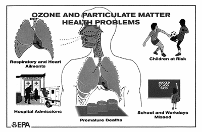 Diesel emissions of nitrogen oxides contribute to the formation of ground level ozone, which irritates the respiratory system, causing coughing, choking, and reduced lung capacity. Ground level ozone pollution, formed when nitrogen oxides and hydrocarbon emissions combine in the presence of sunlight, presents a hazard for both healthy adults and individuals suffering from respiratory problems. Urban ozone pollution has been linked to increased hospital admissions for respiratory problems such as asthma, even at levels below the federal standards for ozone.